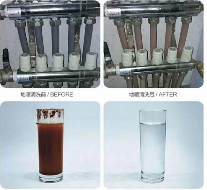 我公司采用高科技脉冲式暖气管道清洗机,清洗地暖自采暖系统,将气和水的混合介质在高压脉冲气流的作用下形成高能量的冲击波和空瀑水射流,对管内淤积的粘泥和挂垢等物质进行剧烈冲刷。利用物理气压脉冲原理,高速射流、可控脉冲所形成的物理波,对管内壁的挂垢和管内的存积物进行冲击和微波震动,并逐层剥落快速排出管外。清洗后的地暖管道如新流速快,制热效果迅速好转。
